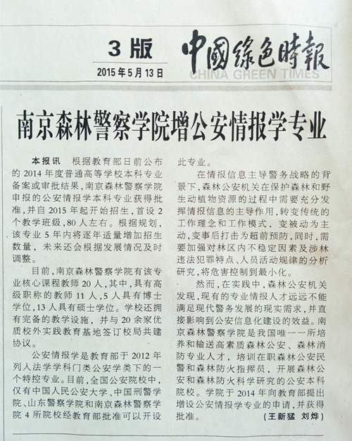 近期,教育部公布了2014年度普通高等学校本科专业备案或审批结果,我校申报的公安情报学本科专业获得批准。5月13日,《中国绿色时报》对我校新增公安情报学专业进行报道。