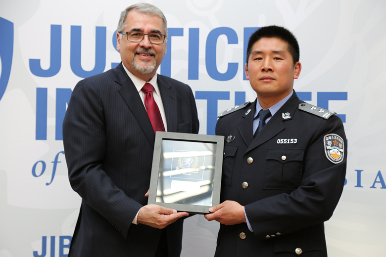 在5月14 日举行的培训班结业仪式上,不列颠哥伦比亚省司法学院院长Michel Tarko出席并与我校互赠纪念品留念,警察学院院长Steve Schnitzer、国际部主任K.M. Davies、司法学院中加交流项目主任齐科向学员颁发结业证书,并同全团参训师生一一合影,为本次培训交流项目画上了圆满的句号。