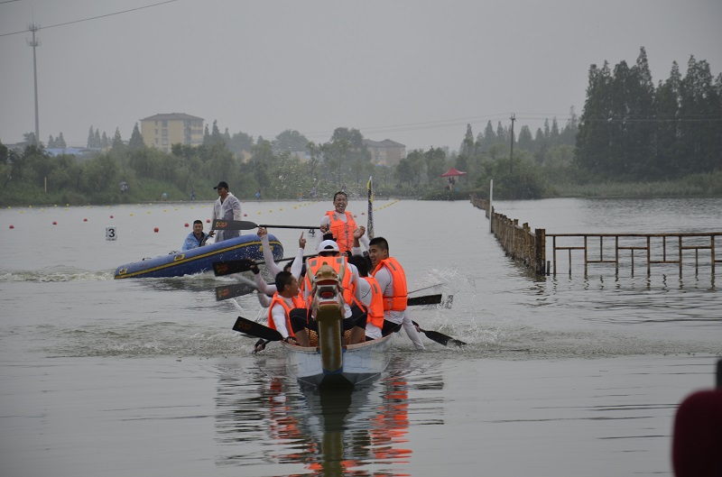 比赛当天,我校龙舟队员在比赛中顶风冒雨,背负伤痛,也依然坚持到底。始终做到“以旗为眼,以鼓为节,桡齐起落整齐一致。”最后在决赛中凭借五米多的绝对优势率先冲过终点。