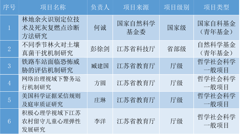 何诚老师申报的“林地余火识别定位技术及死灰复燃点诊断方法研究”项目喜获国家自然科学基金(青年基金)项目资助。这是我校首个国家自然科学基金(青年基金)项目,也是近年来在承担国家自然科学基金项目工作上的再次突破。此外,学校连续两年获得江苏省自然科学基金项目立项资助,分别由何诚、彭徐剑两位老师主持承担;臧建国、方圆、庄琳、李洋4位老师也分别获得2015年度教育厅高校哲学社会科学研究项目立项资助。