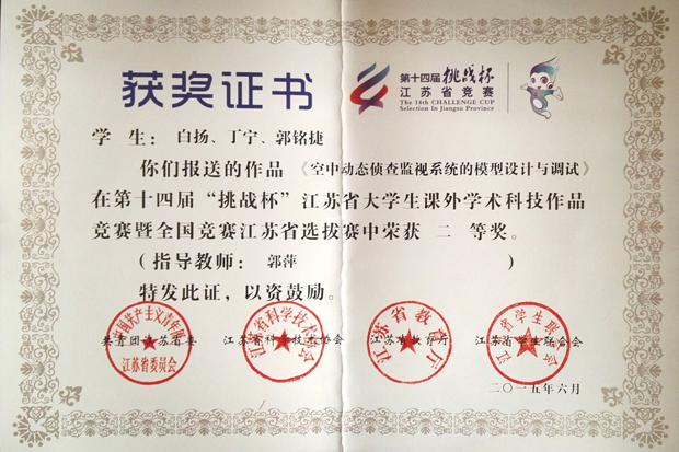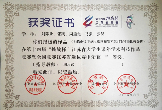 近日,由共青团江苏省委、省科协、省教育厅和省学联联合主办的第十四届“挑战杯”江苏省大学生课外学术科技作品竞赛暨全国竞赛江苏省选拔赛的获奖结果公布。我校作品《空中动态侦查监视系统的模型设计与调试》(指导老师:郭萍,作者:侦查学1101区队的白扬等3名同学)荣获二等奖,作品《扫描电镜下花尾榛鸡和黑琴鸡羽毛特征比较分析》(指导老师:周用武,作者:刑技1205区队的刘陈业等5名同学)和作品《基于winform的电子卷宗采集与管理系统设计与开发》(指导老师:王新猛;作者:情报1202区队的张晓熙)荣获三等奖。
