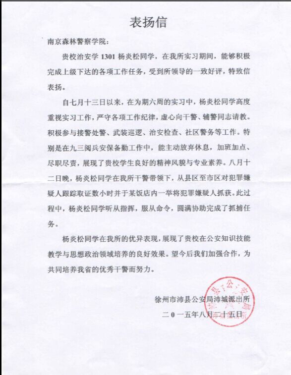 2015年9月11日,江苏省徐州市沛县公安局沛城派出所向我校寄来了一封“表扬信”,对我校治安一大队治安学1301区队杨炎松同学在今年暑期公安见习中的优异表现予以了肯定,并对我校在公安知识技能教学和思想政治领域的培养进行了高度赞扬。