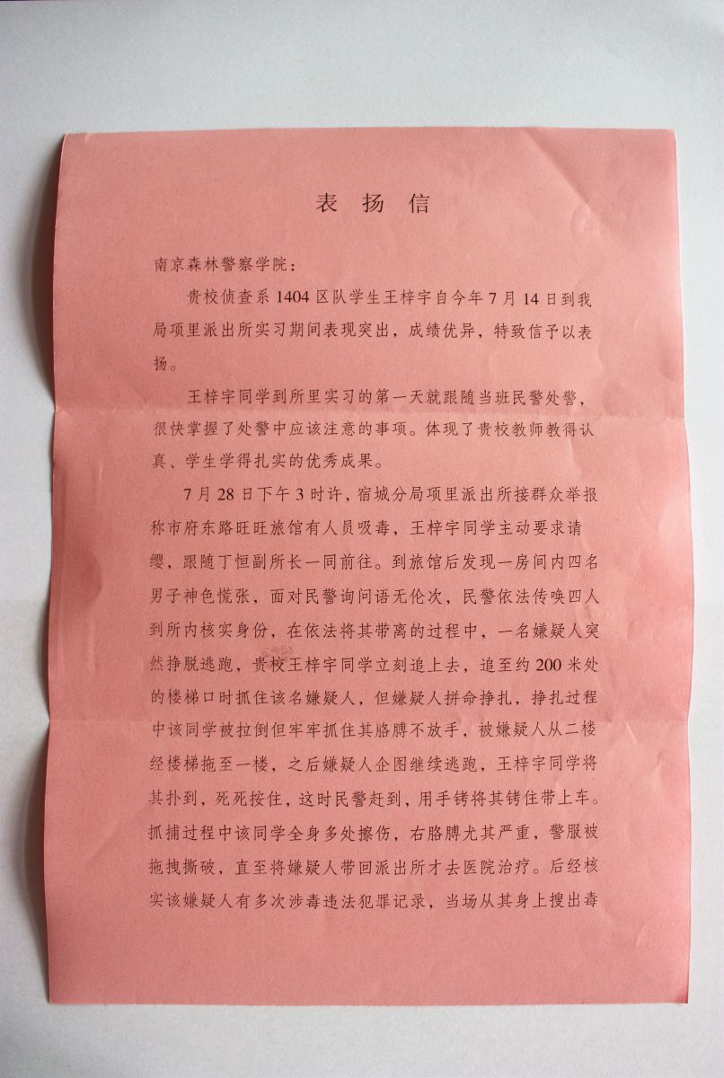 近日,学生工作处收到了一封特殊的来信,是宿迁市公安局宿城分局寄来的表扬信。信上写道,我校侦查系1404区队学生王梓宇在项里派出所实习期间表现突出,成绩优异,体现了我校教师教得认真、学生学得扎实的优秀成果。