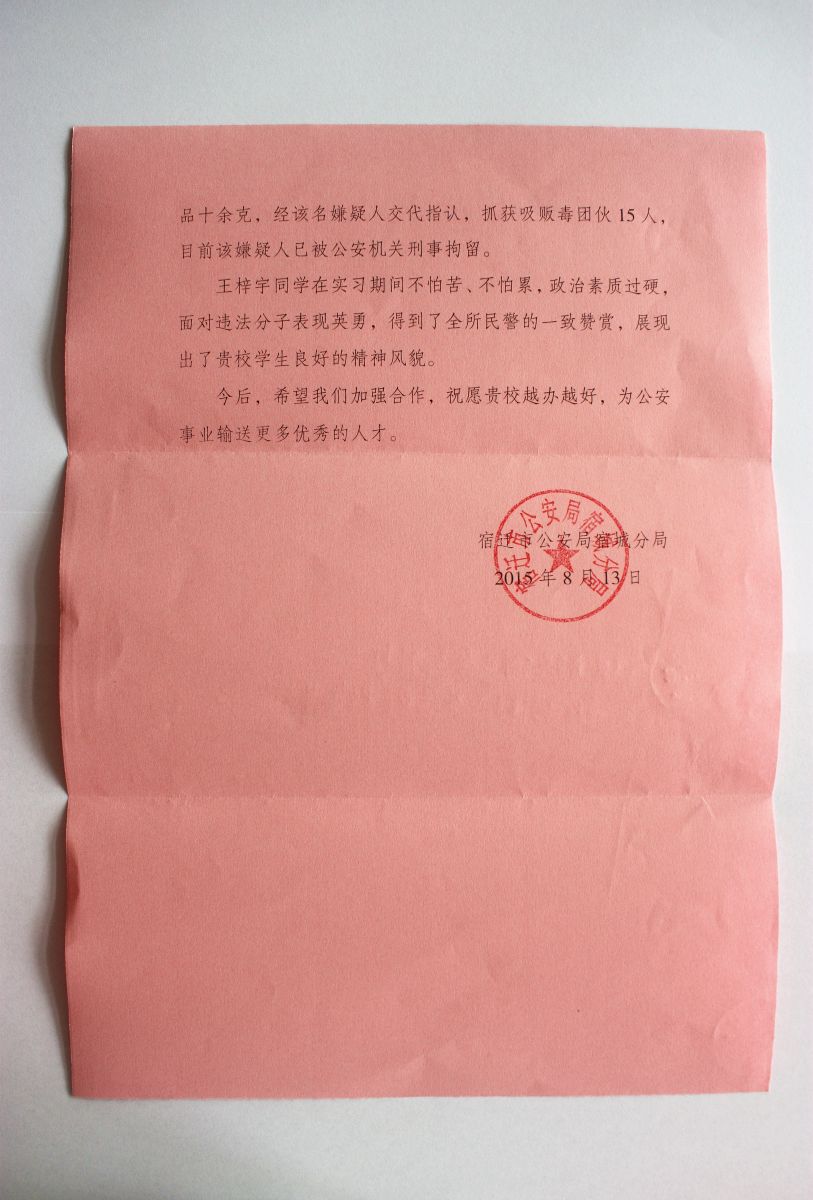 近日,学生工作处收到了一封特殊的来信,是宿迁市公安局宿城分局寄来的表扬信。信上写道,我校侦查系1404区队学生王梓宇在项里派出所实习期间表现突出,成绩优异,体现了我校教师教得认真、学生学得扎实的优秀成果。