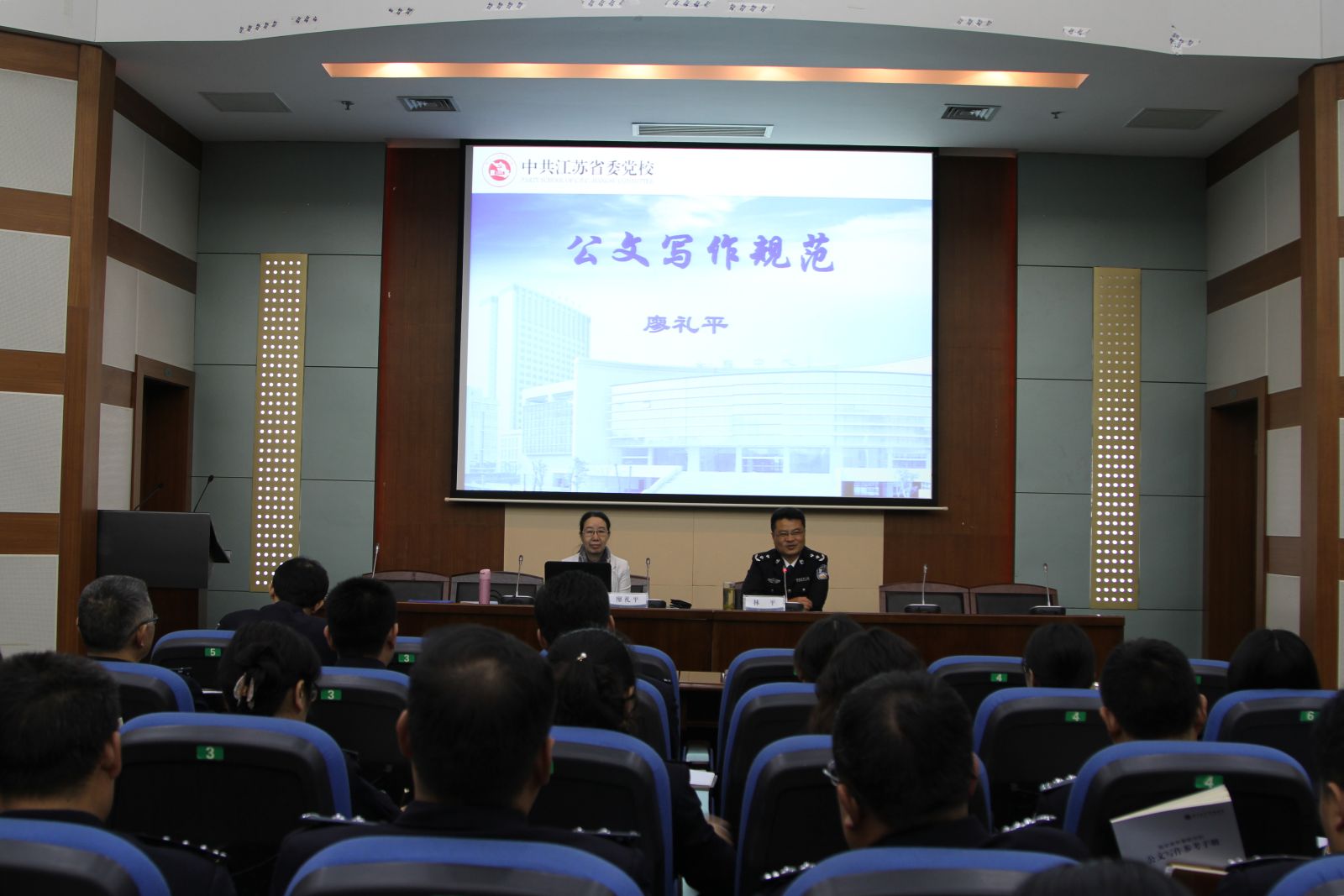 2015年11月12日,中共江苏省委党校文化学与文化建设教研部主任廖礼平教授应邀为我校作了文书写作专题讲座。讲座由党委副书记林平主持,各系各部门负责人、系办主任、教学秘书以及各部门负责文字的有关工作人员参加培训。