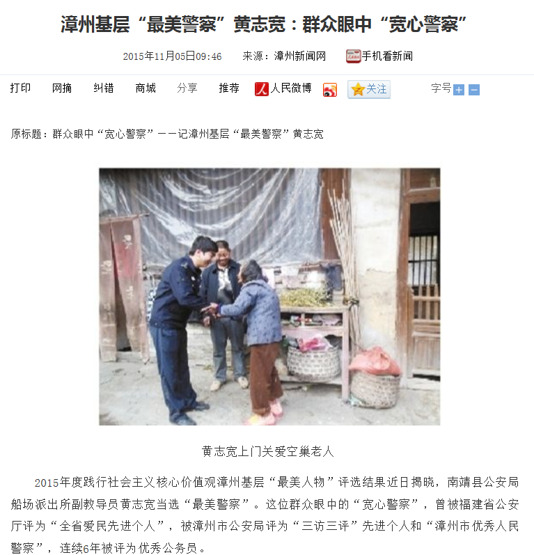据悉,此次“最美人物”评选活动面向全市各行各业,群众眼中的“宽心警察”黄志宽经过当地社区、乡镇、县公安局以及市公安局层层推荐评选,最终成为唯一获此殊荣的公安民警,成为当地警察的楷模。从学校毕业后,在多年的公安工作实践中,黄志宽先后被福建省公安厅评为“全省爱民先进个人”,被漳州市公安局评为“三访三评”先进个人和漳州市“优秀人民警察”,连续6年被评为优秀公务员。