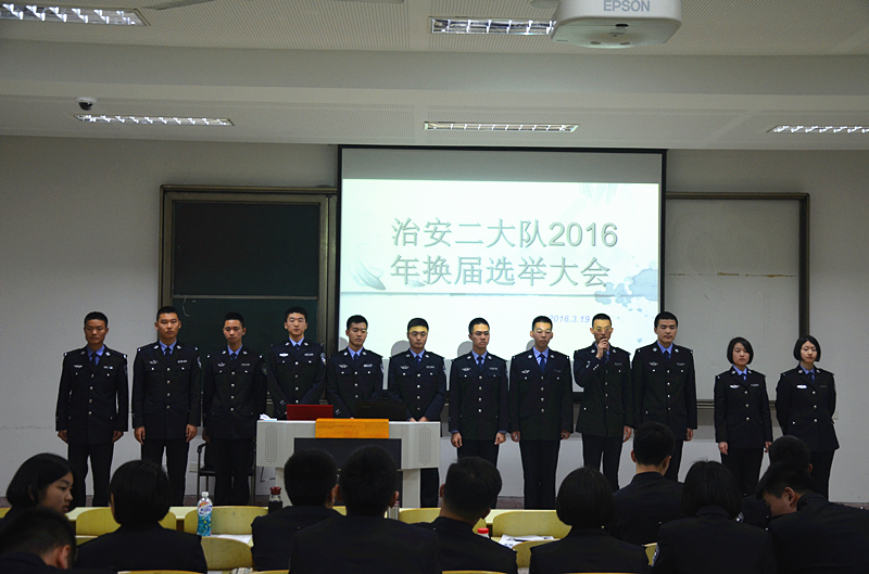 2016年3月19日晚19时,治安二大队在110教室举办本年度学生分会换届选举大会。学生分会主席团、大队分团委、各部门干事及14 、15级区队长、团支书、党员、入党积极分子均出席了本次大会。