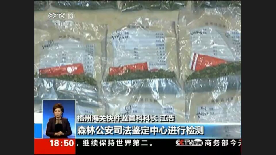 中央电视台新闻频道(CCTV-13)于4月19日晚的《共同关注》节目中报道:广西梧州海关破获了一起通过国际快递渠道走私毒品的案件,查获涉嫌走私的新型毒品恰特草近8千克,抓获犯罪嫌疑人一名。在案件侦破过程中,国家林业局森林公安司法鉴定中心受广西梧州海关委托,参与案件侦破过程中的恰特草鉴定工作。 恰特草又称东非罂粟,其叶片成分中含有国家管制类精神药物卡西酮,人咀嚼后会产生类似冰毒的致幻作用,世界卫生组织将其确定为二类软性毒品,我国2013年将其列管为一类精神药品,将恰特草列入毒品严打的范围之内,但是这种隐蔽性大的新型毒品也给办案带来难度。我中心在收到广西梧州海关的委托后,第一时间组织鉴定人员处理案件,按规定时间完成鉴定工作并出具物证鉴定书,为侦破案件提供了高效而强有力的技术支持。 视频链接:http://tv.cntv.cn/video/C10318/419bfd74643d450c8211f265ce8dc4e4中央电视台新闻频道(CCTV-13)4月19日晚的《共同关注》18:49