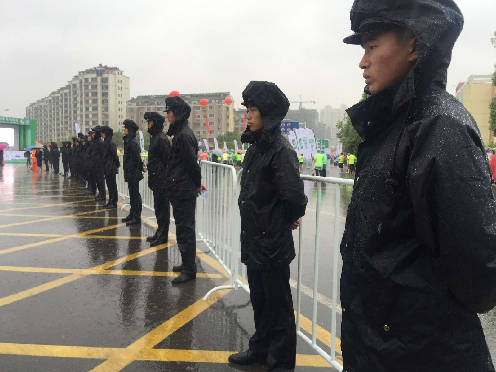 5月15日凌晨4点40分,天空飘着细雨,参加此次安保的同学已在教学楼下集合完毕,整装待发。经过两个小时的车程,同学们来到了金湖县。同学们匆忙早餐后,在当地民警的带领下来到了比赛场地,按照要求站到自己的岗位上,维持赛场秩序,为群众提供帮助。比赛开始十几分钟,小雨逐渐变大,同学们依旧跨立站定,任风吹雨打岿然不动,雨水顺着衣服划下,在地上溅起一朵朵水花。