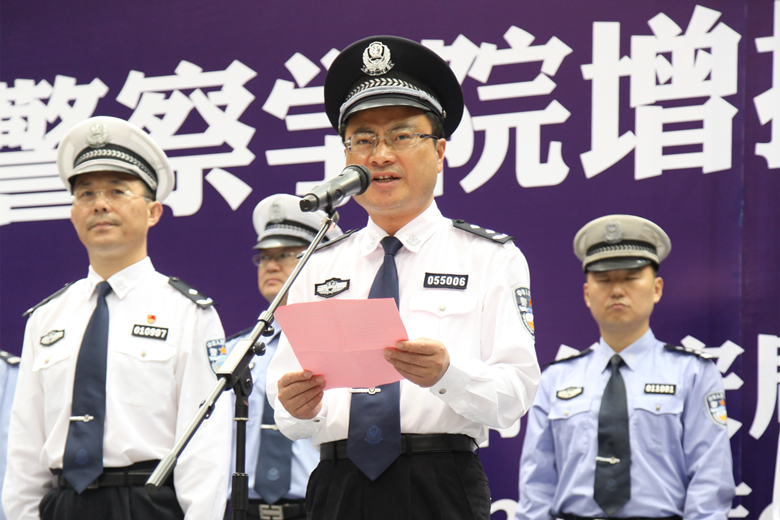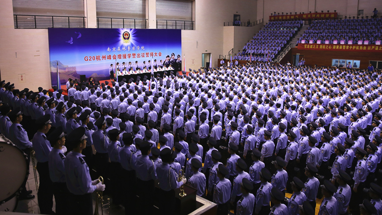 南京森林警察学院G20安保副总指挥、学工处处长邹友宁带领学生宣誓:牢记重托,履行使命;服从命令,听从指挥;严格自律,热情服务;吃苦耐劳,甘于奉献;恪尽职守,勇于担当;保G20峰会平安,展南森学子风采!学校领导给各学警安保大队授旗。