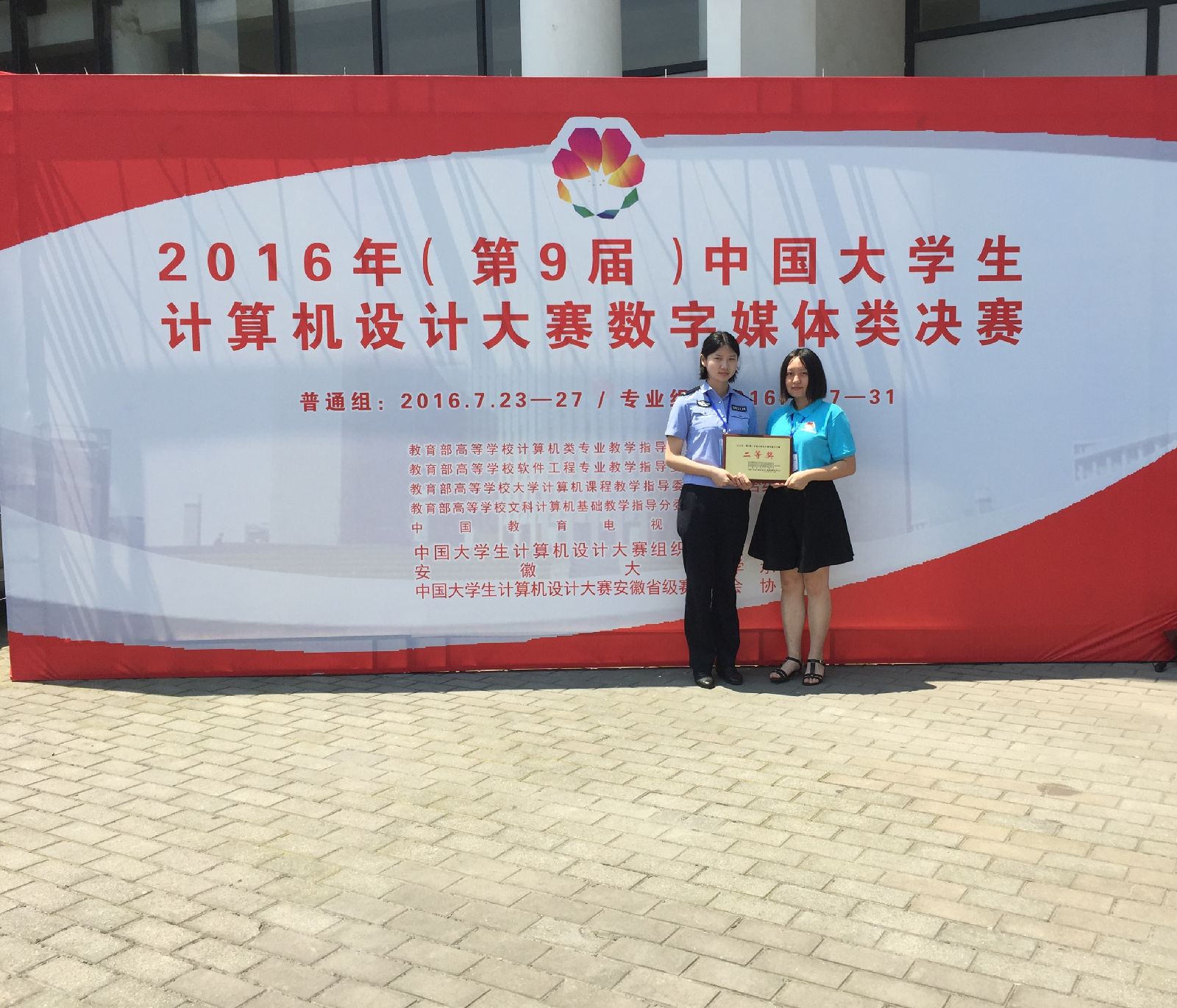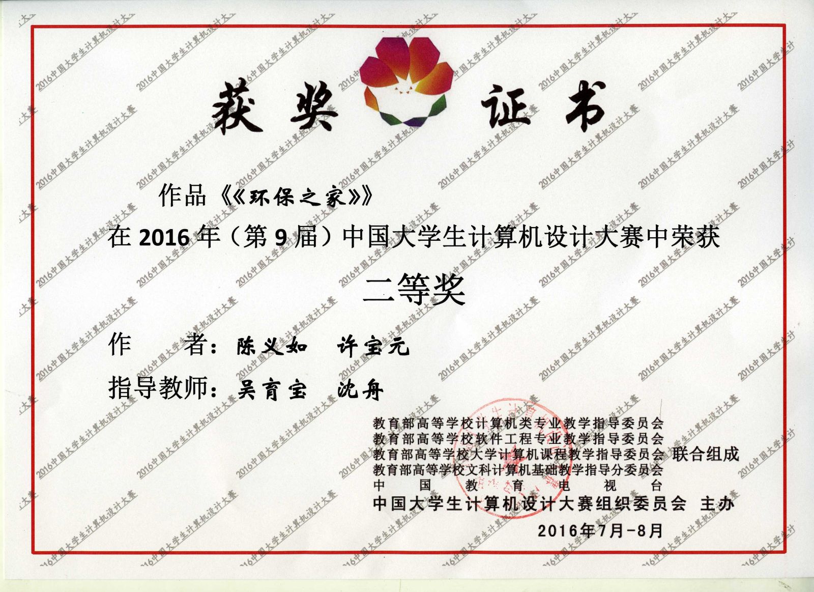 2016年7月23-27日,由中国大学生计算机设计大赛组织委员会主办、教育部高等学校计算机类专业教学指导委员等联合组办的第九届中国大学生计算机设计决赛在安徽大学举行。我校作品《环保之家》由江苏省级大赛组委会作为优秀作品推荐参加了“中国大学生计算机设计决赛”。在决赛中,我校的参赛作品荣获“2016年(第9届)中国大学生计算机设计大赛二等奖” 。该作品由网安1303陈义如和网安1302许宝元同学创作,我系赵明生、吴育宝和沈舟老师指导,沈舟老师带队参加。