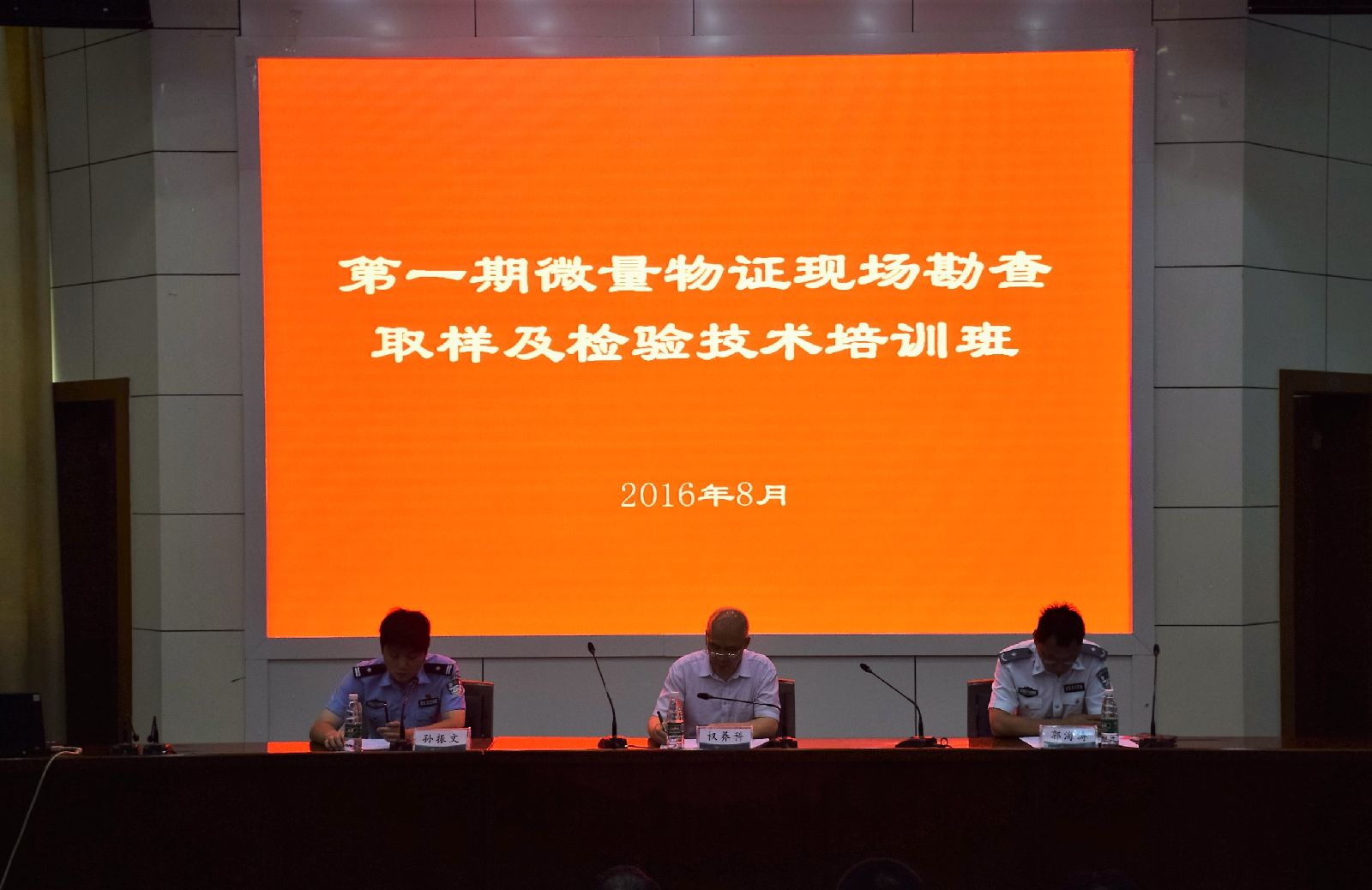 2016年8月3日上午8点半,由公安部物证鉴定中心主办,我校承办的“第一期微量物证现场勘查取样及检验技术培训班”在我校开班。公安部物证鉴定中心副巡视员理化检验专家权养科、刑事科学技术系主任郭海涛、微量物证检验技术处副处长孙振文出席开幕式并讲话。开幕式由孙振文副处长主持,来自全国各地200余名刑事技术一线干警参加此次培训。