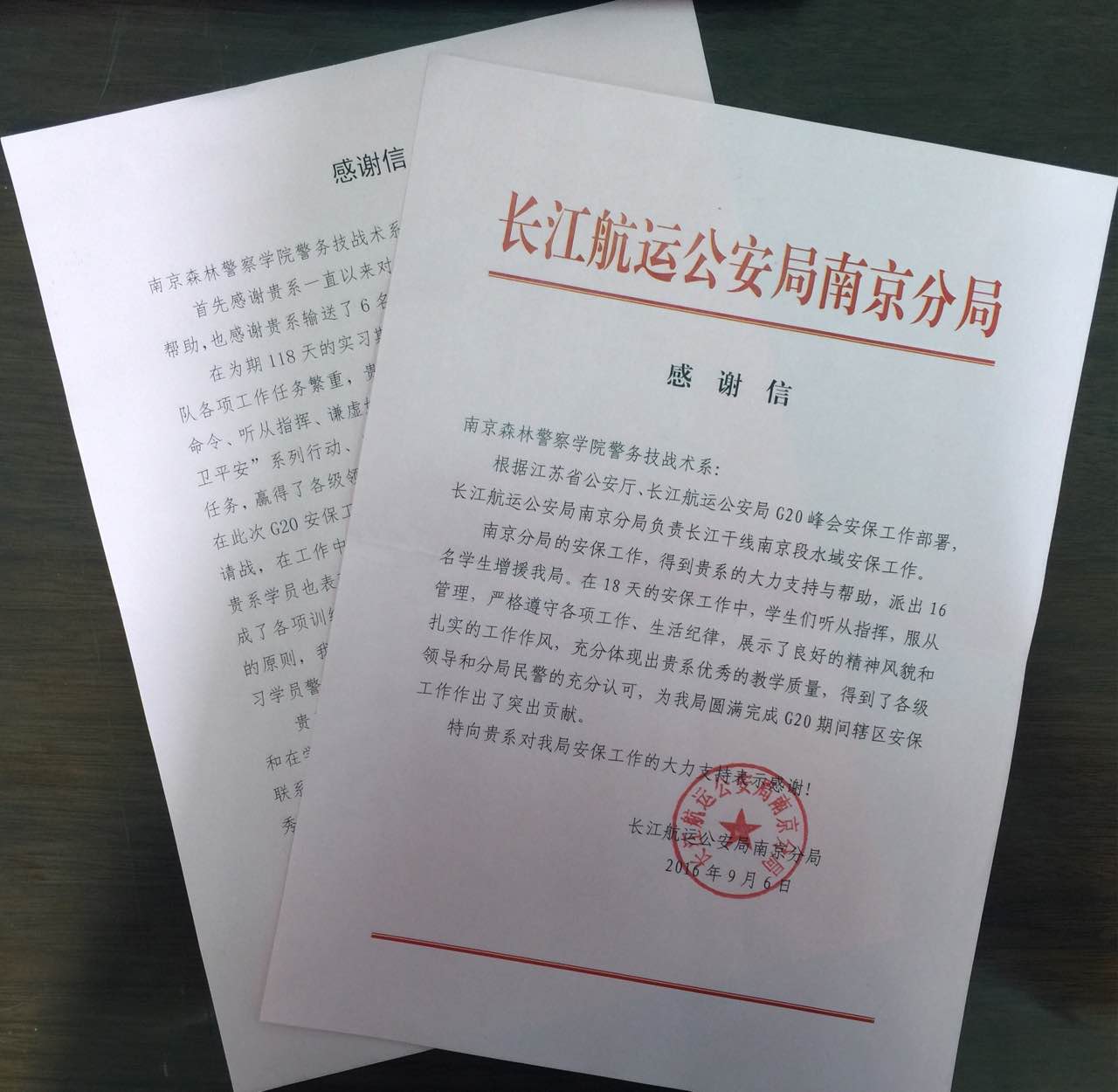 近日,长江航运公安局南京分局、湖州市公安局特警支队分别发来感谢信,肯定了警务技战术系学生在G20峰会期间圆满完成辖区安保任务所作的突出贡献,赞扬了南森特警学员优良的作风及过硬的素质。并表示希望同系部继续保持密切的联系,全面加强合作。