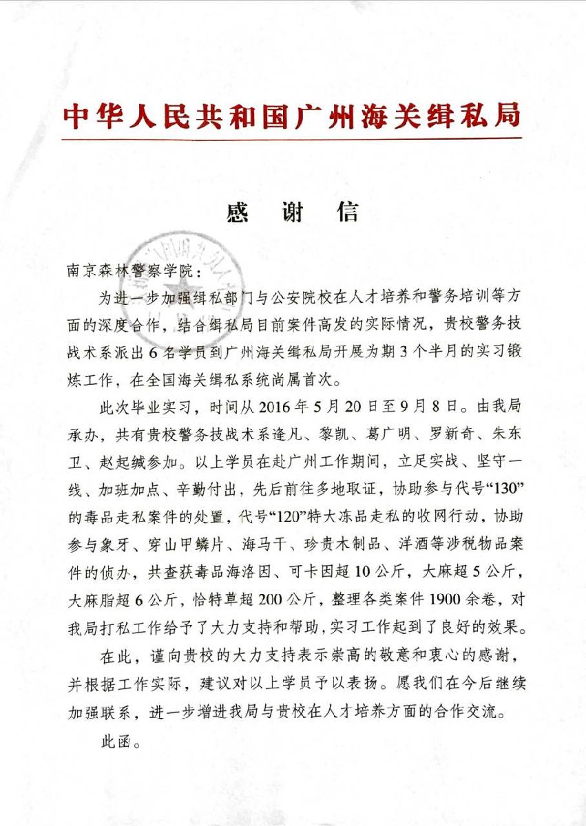 近日,广州海关缉私局致信我校,就警务技战术系特警学员在缉私局实习期间的优秀表现表示感谢。