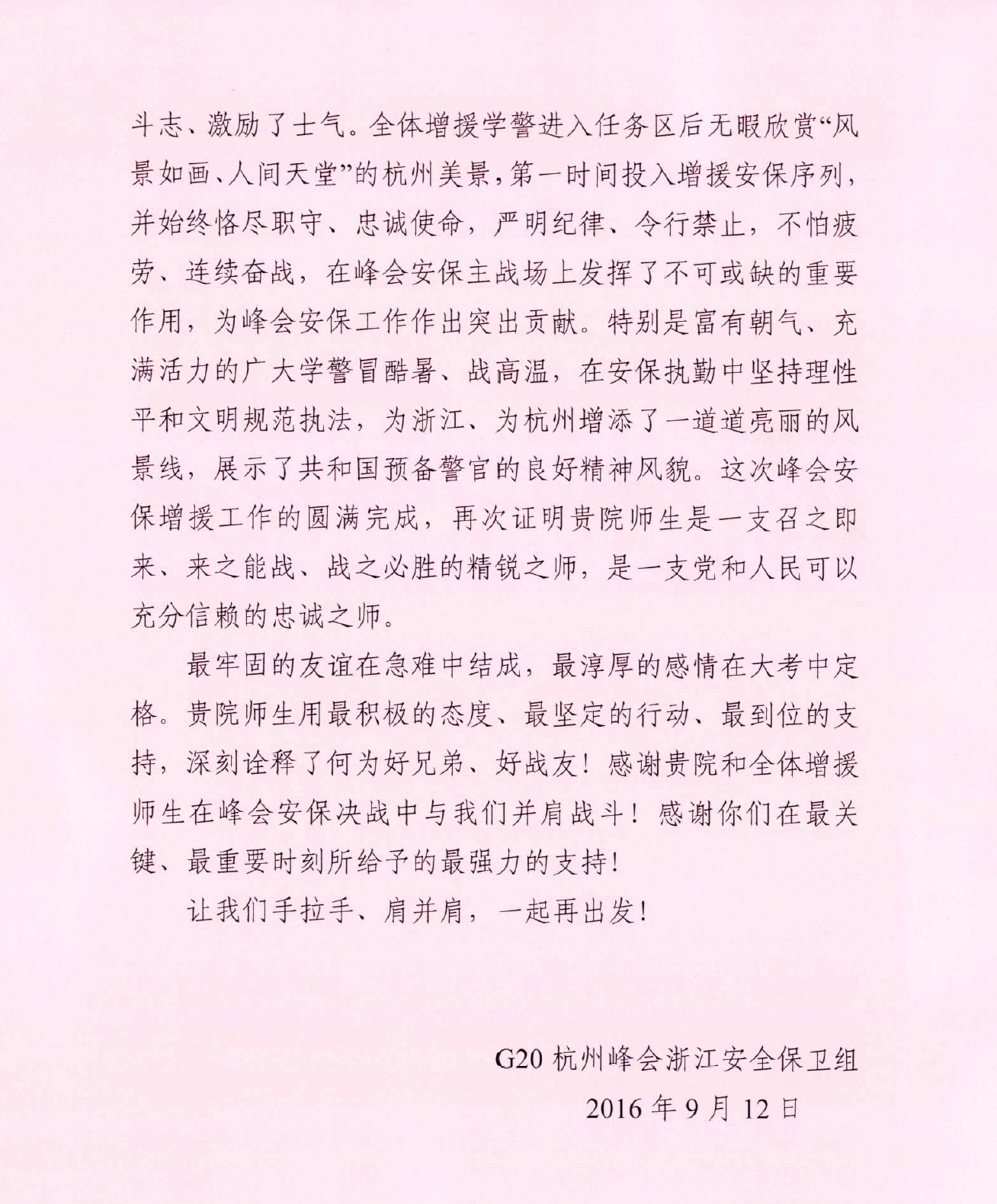 感谢信中说,在峰会筹备和举办的过程中,贵校以大局为重、大公无私,积极伸出援助之手,派出3000余名学警,带队领导干部不辞劳苦、扎根一线、精细管理,广大增援警力服从命令、听从指挥、尽职尽责,战斗在峰会安保的主战场、维护未定的第一线、服务群众的最前沿,为峰会成功举办立下了汗马功劳。G20峰会虽已落幕, 但峰会安保纽带形成的情谊必将永存,期盼与贵校继续巩固和发展血浓于水的战友情谊,深化协作,携手共进,共创美好未来。