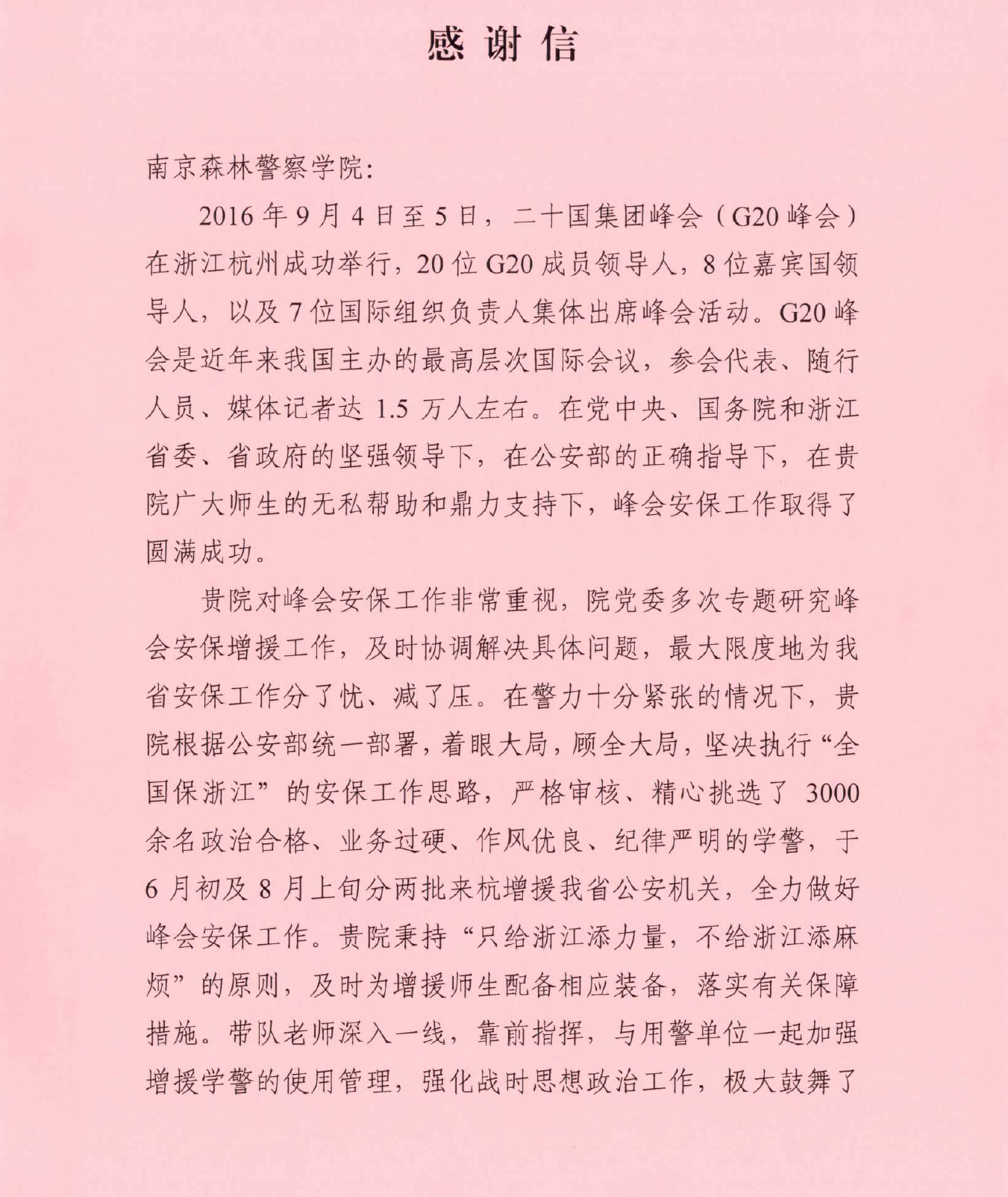近日,G20峰会浙江安保组、杭州市公安局专门向我校发来感谢信,对我校在G20杭州峰会活动中所给予的大力支持表示感谢,对参加峰会安保工作的我校师生表示充分肯定。