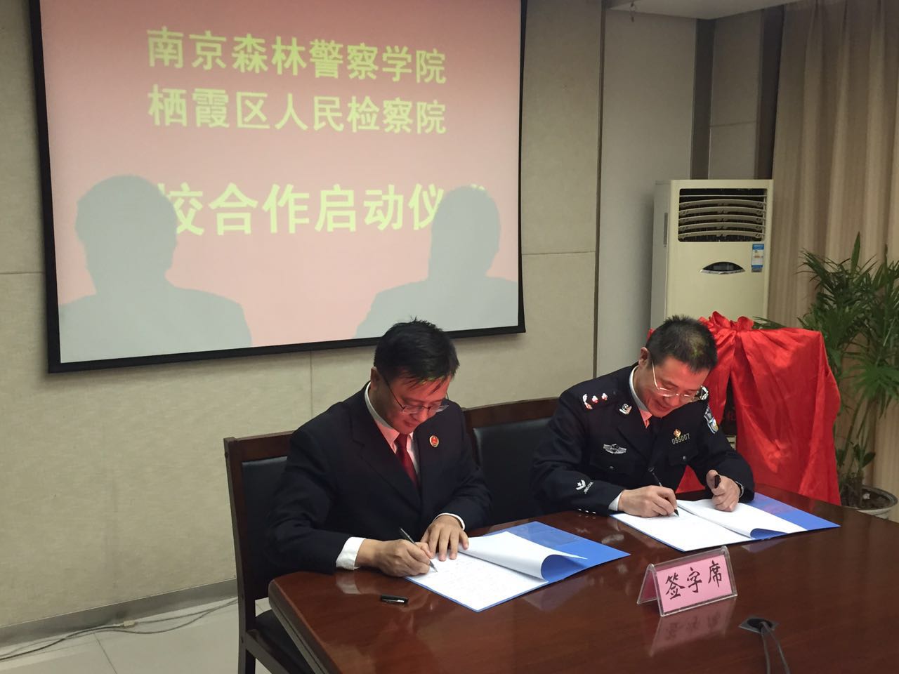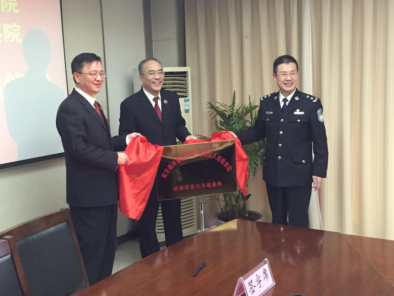 马明玉副检察长首先就校检合作的前期准备情况做了简要介绍,宣读了南京森林警察学院与栖霞区人民检察院校检合作共建协议的主要内容。赵明生主任宣读了检校合作领导小组名单,并介绍了近期将要实施的信息技术应用培训、案例讲座、科学研究等合作项目。随后举行了简短而隆重的揭牌仪式,南京市人民检察院副检察长黄晓非、栖霞区检察院检察长倪一斌和我校副校长陶珑三人共同为“侦查信息化共建基地”揭牌。