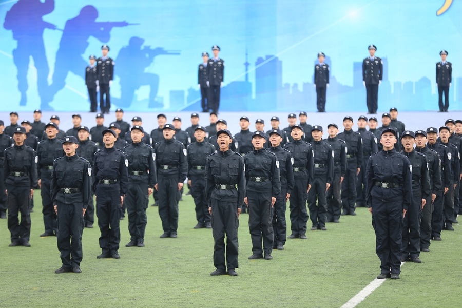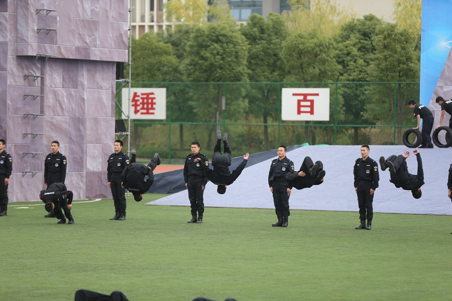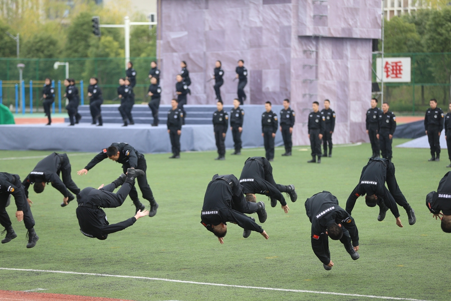 开幕式上,由我校158名特警师生参演的警务搏击表演精彩亮相,他们一招一式整齐划一,一拳一腿迅速有力,表演了远踢、近打和贴身摔接控制等动作,场面震撼人心,充分展示了我校的警务实战教学特色和我校师生扎实过硬的基本功以及不惧艰难、勇于担当、攻坚克难的精神风貌,赢得了现场观众的阵阵喝彩。