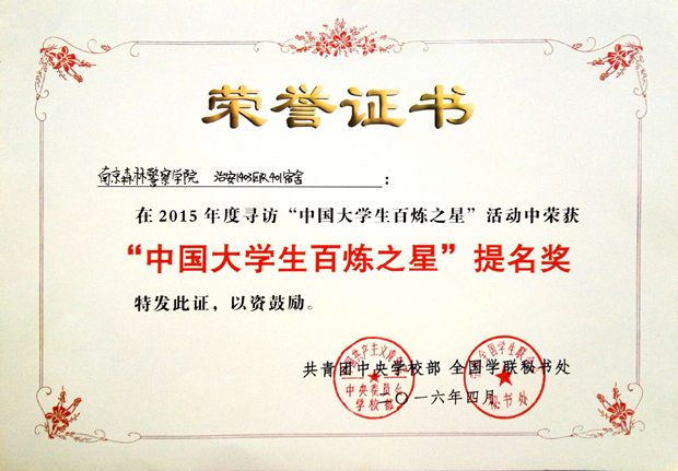 近日,由团中央学校部、全国学联秘书处联合开展的2015年度寻访“中国大学生百炼之星”活动结果公布,我校治安1403区队401宿舍荣获2015年度“中国大学生百炼之星”提名奖。