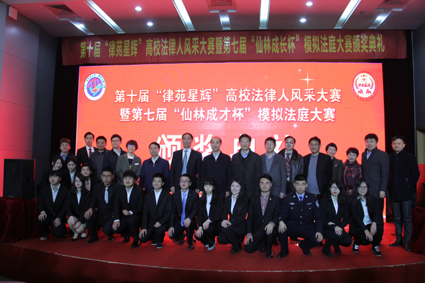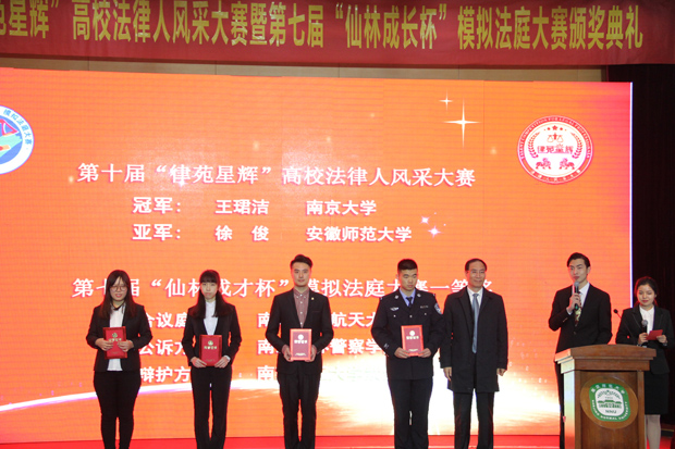 12月8日,江苏省第七届“仙林成才杯”模拟法庭大赛颁奖典礼在南京师范大学敬文图书馆报告厅隆重举行,司法部法宣司副司长李志路,团中央权益部副部长姚建龙,江苏省法学会副会长刘克希,栖霞区委常委、政法委书记孙爱军,南京师范大学党委副书记王建,共青团江苏省委权益部部长陶莉,江苏省司法厅法宣处副处长许建彤等领导及嘉宾出席了本次颁奖典礼。
