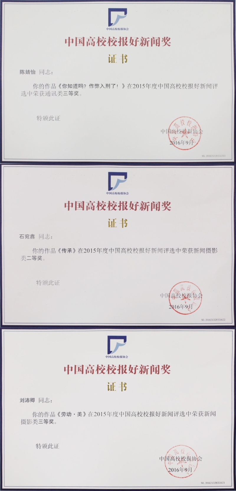 近日,2016年度中国高校校报好新闻评选结果公布,我校《森林警院报》送评作品《传承》(作者:侦查1407石宛鑫)、作品《劳动.美》(作者:侦查1308刘沛卿)分别荣获新闻摄影类二等奖和三等奖,作品《你知道吗?作弊入刑了!》(作者:侦查1407陈婧怡)荣获通讯类三等奖。