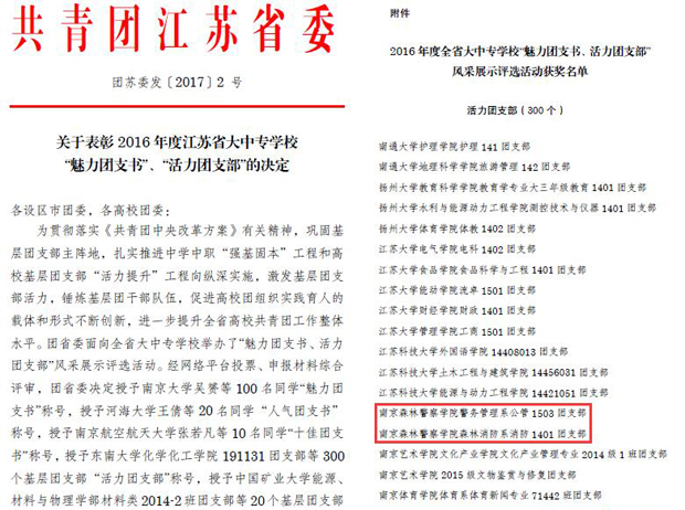 为贯彻落实《共青团中央改革方案》有关精神,巩固基层团支部主阵地,激发基层团支部活力,锤炼基层团干部队伍,促进高校团组织实践育人的载体和形式不断创新,进一步提升全省高校共青团工作整体水平,团省委面向全省大中专学校举办了“魅力团支书、活力团支部”风采展示评选活动。我校经各分团委推荐、校团委审核,报送了6个团支部参加了省级评比。经网络平台投票和团省委综合评审,最终, 公管1503 和消防1401 团支部获得省级表彰。