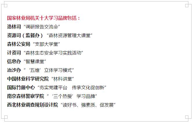 近日,国家林业局优秀学习品牌案例征集活动评选结果揭晓,共评选出国家林业局机关十大学习品牌、国家林业局基层党组织十大学习品牌和14个国家林业局优秀学习品牌。我校“三个热爱学习品牌”荣获“国家林业局机关十大学习品牌”。