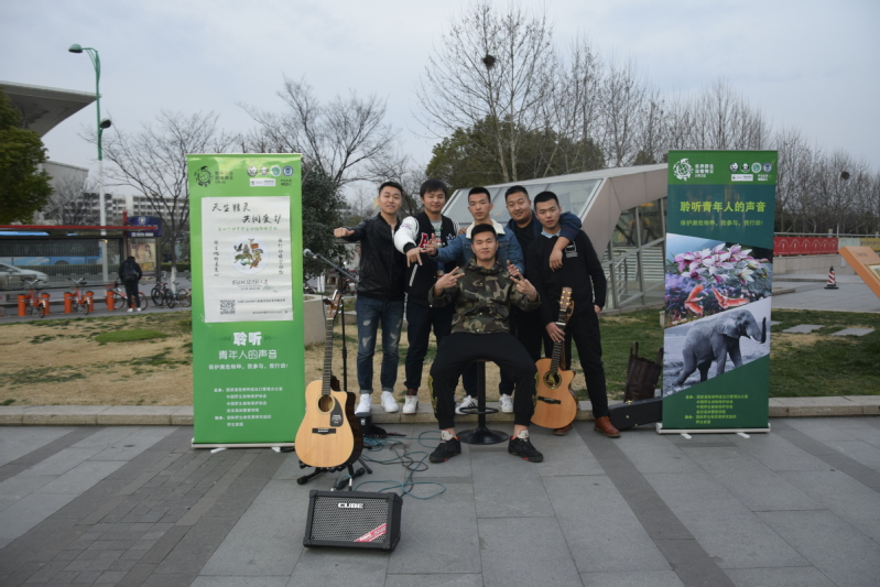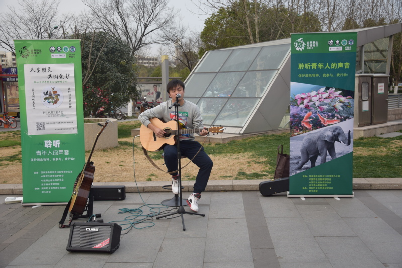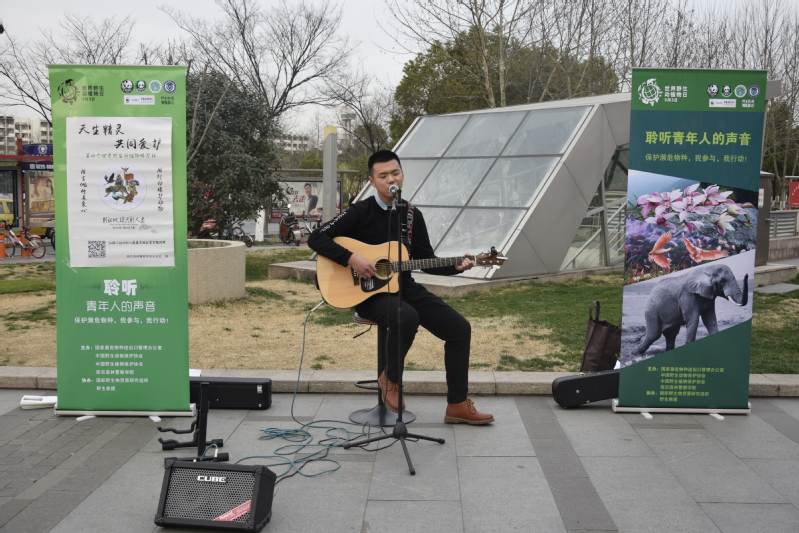 3月3日下午,为宣传“保护濒危物种,我参与,我行动”的理念,我校吉他协会在仙林大学城东城汇广场举行了一场以“用吉他传递爱心,用行动保护动物”为主题义演宣传活动,用歌声向广大市民宣传了保护野生动物的重要意义。