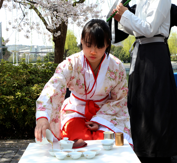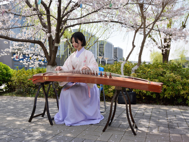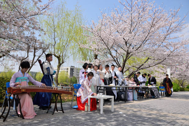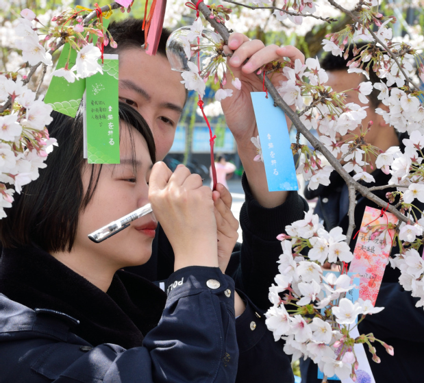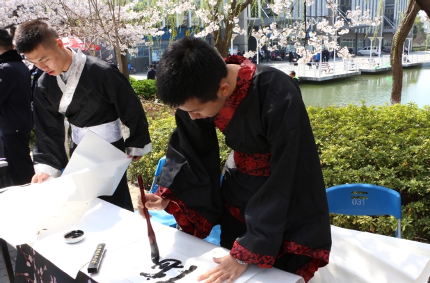参加活动的同学穿上美丽的汉服,在樱花雨中,握画笔细细涂抹、提毛笔挥毫泼墨、执棋子气定神闲、拨琴弦悦耳动听,还有的同学用娴熟的手法为过路的同学泡上了一壶沁人心脾的茶。在传统的“赏红”环节,来往同学参与的热情也非常高,他们纷纷在祈愿签上写下了对未来的美好期许,活动组织的同学贴心地为大家把祈愿签挂在了樱枝上,希望所有人的祈愿都能成真。