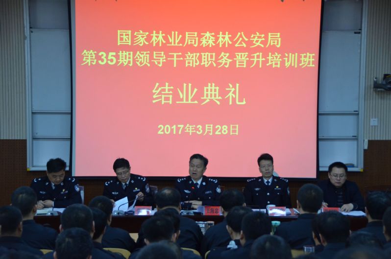 3月28日上午,全国森林公安机关第35期领导干部职务晋升训练班结业典礼在警官培训中心举行。国家林业局森林公安局局长王海忠,南京森林警察学院党委书记王邱文、常务副校长张治平、国家林业局森林公安局政治处干部陈国保、警官培训中心常务副主任顾其银出席典礼,结业典礼由顾其银常务副主任主持。来自全国22个省(区、市)的125名参训学员参加了结业典礼。