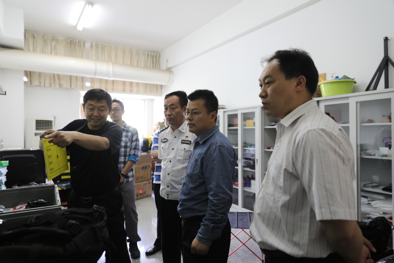 唐前进博士在校长张高文,国家林业局森林公安局装备处处长敖孔华的陪同下查看了我校自主研发的涉林案件装备,并提出了合理化意见建议。