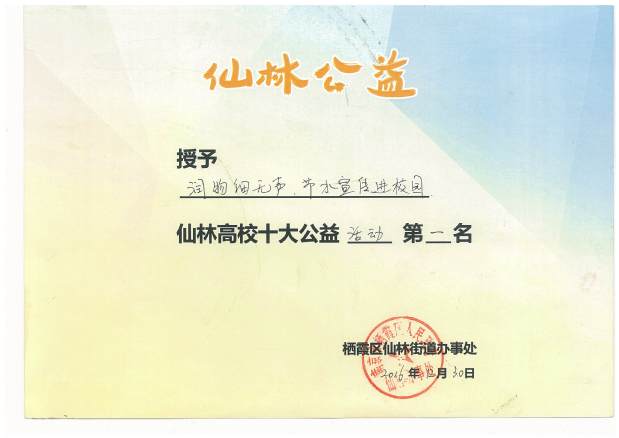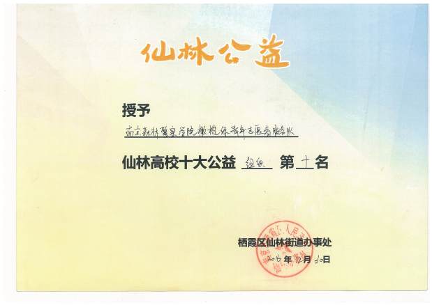 近日,仙林街道“两学一做”学习教育常态化、制度化、网格化志愿者广场活动在金鹰奥莱城旁广场举行。我校橄榄绿青年志愿者服务队的“润物细无声,节水宣传进校园”活动被评为仙林高校十大公益活动第一名,橄榄绿青年志愿者服务队被授予仙林高校十大公益组织第十名。