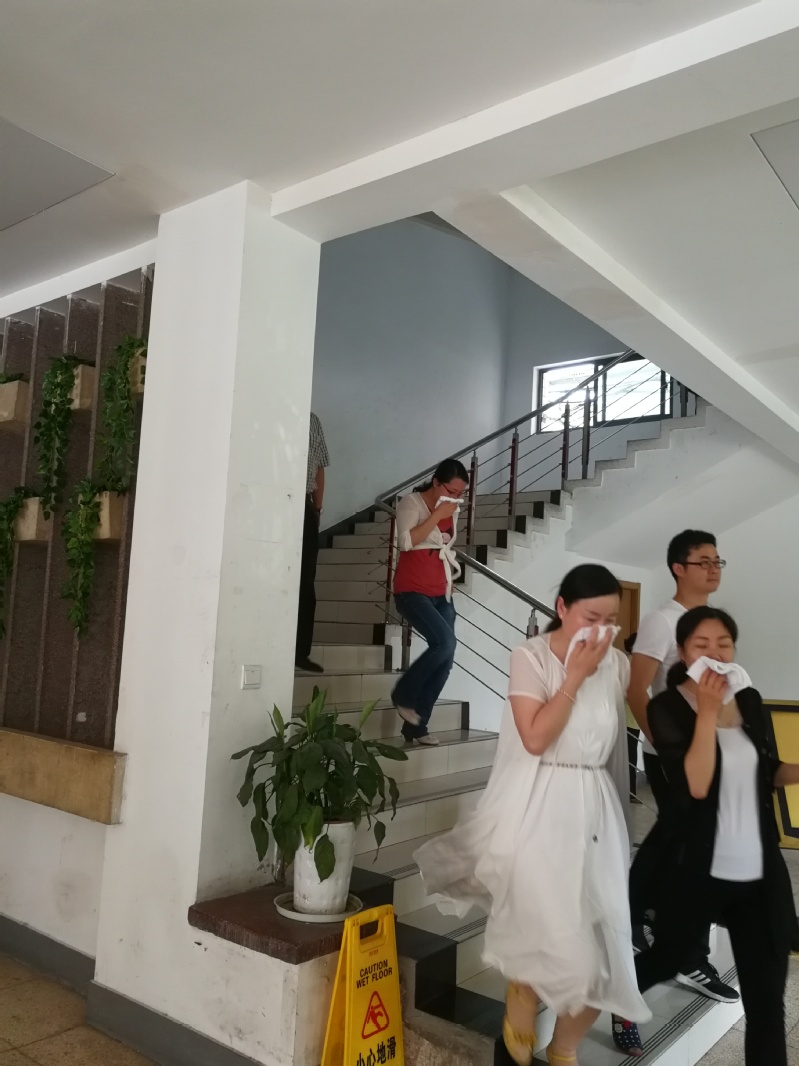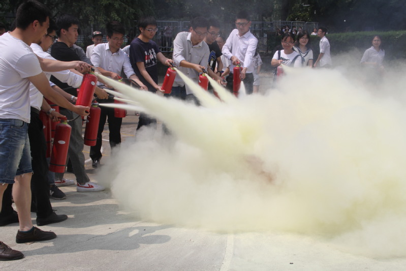 随着指挥教官下达的指令,各单位员工紧张有序地疏散出工作场所和宿舍区,按照规定路线迅速地离开,迅速到指定的操场集合。随后,保卫处组织对员工讲解消防灭火器的使用注意事项和操作要领,并进行现场灭火演练。