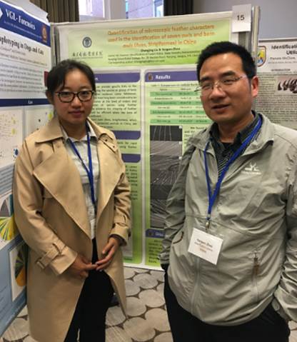 我校刘昌景和周用武老师的论文“Quantification of microscopic feather characters used in the identification of seven owls and barn owls (Aves, Strigiformes) in China”受邀作海报展示,该研究内容引起了多国参会代表的兴趣,两位老师就论文内容与参会人员进行了深入的学术交流。