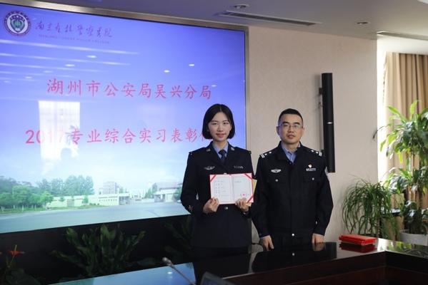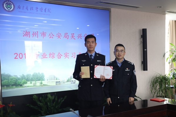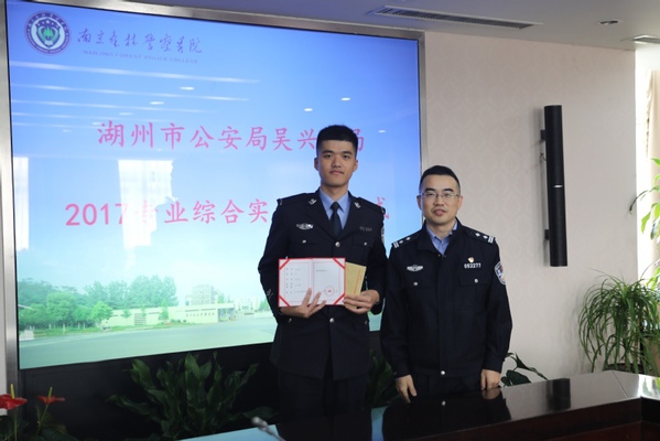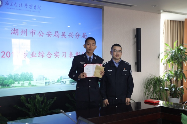 吴宇昕同志代表湖州市公安局分别向4位同学颁发了湖州市公安局签发的嘉奖证书及2000元奖金,并对我校全体实习生在实习期间所表现出来的顽强作风、服从意识和专业能力表示高度赞赏。湖州市公安局吴兴分局党委员、副政委、政治部主任吴冬儿、分局政治部民警孙怡平及我校教务处、治安学院、信息技术学院江林升、刘成林、王新猛、刘鹏和4名学生参加了嘉奖仪式。