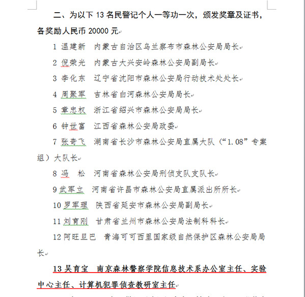 日前,国家林业局森林公安局发文,对紧紧围绕生态文明建设大局,恪尽职守、攻坚克难、顽强拼搏、无私奉献,为保护森林和野生动植物资源、巩固生态建设成果、维护国家生态安全做出突出贡献,涌现出的一大批工作扎实、成绩突出的先进集体和先进个人进行表彰。我校信息技术学院副院长吴育宝在第二届全国公安院校教学技能大赛比赛中荣获个人一等奖,被记个人一等功。