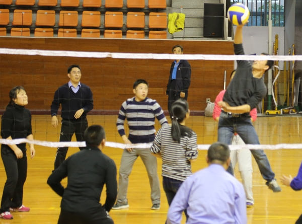 比赛分两个阶段进行,第一阶段为小组循环赛,第二阶段为交叉淘汰赛,沿用男女混合制,每队上场三男两女。赛场上有刚刚入校的年轻教师,有我校常年活跃的体育明星,也有各分会的党政领导。各代表队的运动员配合默契,团结协作,迅猛的发球、巧妙的拦网、精彩的扣杀,迎来一个又一个比赛高潮。整个警体馆加油声、欢呼声、鼓掌声一浪高过一浪,气氛热烈,精彩纷呈。