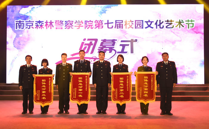 在第七届校园文化艺术节闭幕式上,校党委王邱文书记、吉小林副校长、叶卫副校长、冯斌总会计师为团体总分排名前四的大队颁发锦旗。信息大队荣获团体总分第一名,治安二大队荣获团体总分第二名,管理大队荣获团体总分第三名,侦查二大队荣获团体总分第四名。
