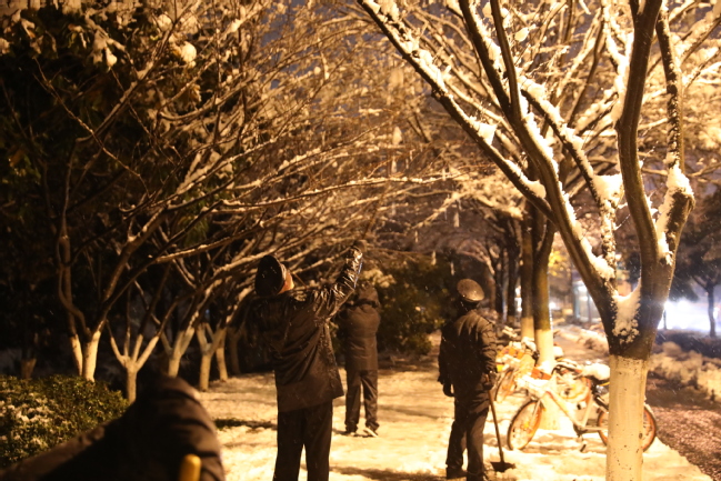 1月4日晚19时许,师生集合完毕,在各学管大队长的带领下有序来到仙林街道10余个社区和大学城主要干道、地铁、车站,迅速投入到紧张而忙碌的扫雪工作中。由于此次降雪持续时间长,导致路面积雪较多较厚,为大家的扫雪工作带来了许多困难。但是全体师生克服严寒,顶风冒雪,服从命令、听从指挥,分工明确、团结协作,认真细致地完成每个环节。每名参战师生的双脚都在冰冷的雪水中浸泡了6个多小时,但大家纷纷表示“还可以坚持”,用青春的热血融化了冰雪。期间,受出差在外的党委书记王邱文、校长张高文委托,张治平常务副校长、叶卫副校长深入学生当中,送上学校党委的关心和慰问,与学警一起斗风雪、抗严寒,勉励大家风雪不止、战斗不息。