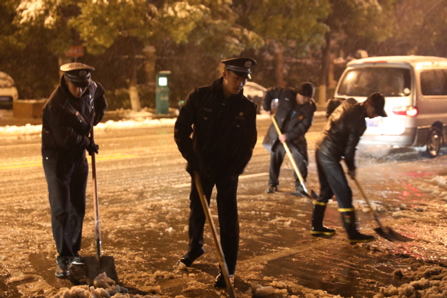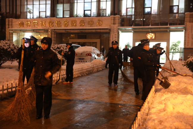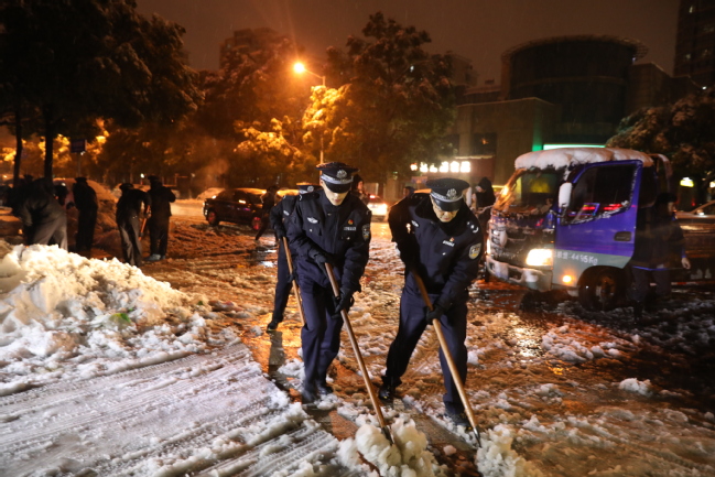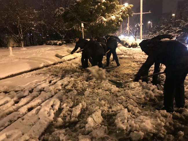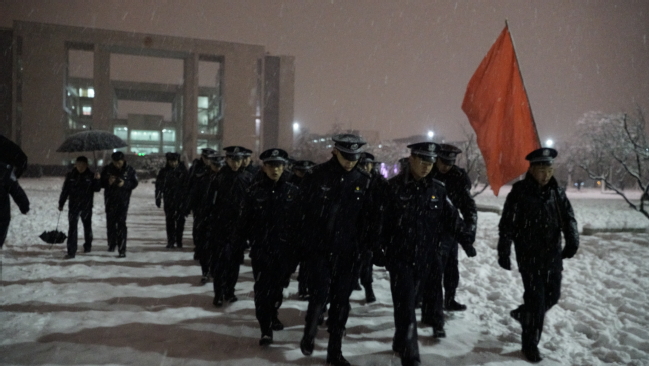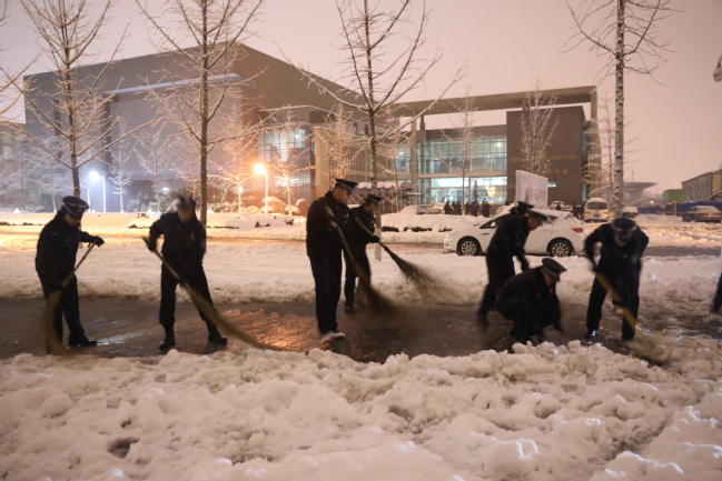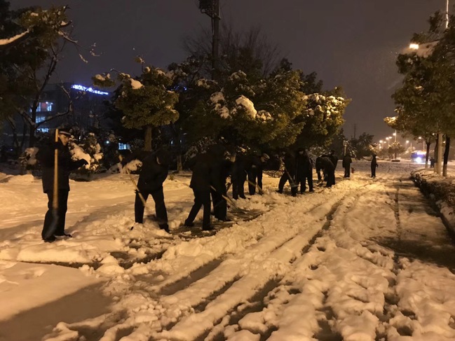 学校认真学习贯彻党的十九大精神,深刻领会习近平总书记提出的“对党忠诚、服务人民、执法公正、纪律严明”总要求,践行人民公安为人民的宗旨,积极响应南京市委市政府关于做好扫雪防冻应急处置工作号召,为清除积雪给群众出行带来的安全隐患,在大学城管委会仙林街道的统筹协调下,组织3000余名师生连夜开展义务扫雪活动。