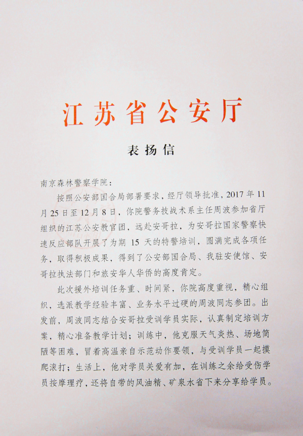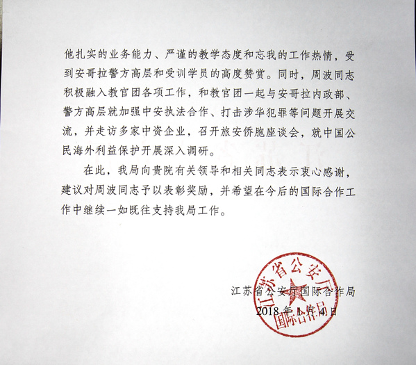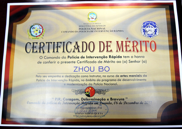 应安哥拉内政部邀请,中国公安部组织的教官团一行7人对该国刚组建的国家警察快速反应部队进行了为期10天的集中培训。培训取得了积极成果,得到了中国驻安使馆、安哥拉执法部门和旅安华人华侨的肯定。我校特警学院党总支书记周波作为此次教官团的重要一员,在安哥拉期间,周波负责教授搏击术,他以扎实的业务水平、严谨的教学态度和忘我的工作热情投入培训,克服了恶劣的气候和陌生的环境,认真教学和沟通交流,取得了优良效果,赢得了安方的广泛赞誉。当地气温炎热、场地简陋,训练当中,周波在为学员示范过顶摔的动作时,为防止陪练学员受伤,他都是慢慢把学员举过头顶后轻放在垫子上,这极大的考验着他的体力;生活当中,周波对学员也是关爱有加,在训练之余给受伤的学员按摩理疗,还将自带的风油精、矿泉水省下来分给学员。所有的这些细节都深深的感染者学员们,结业仪式上,32名学员自编自唱“中安一家人”歌曲为教官团送别。