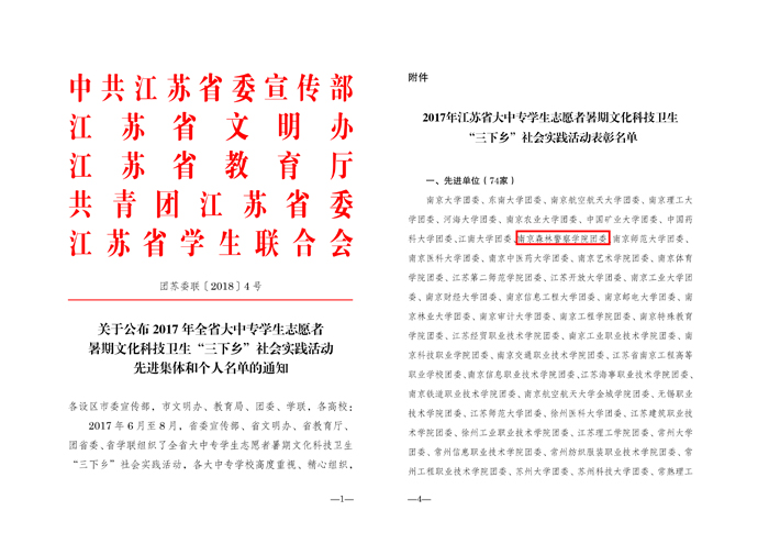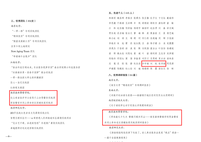 近日, 中共江苏省委宣传部、江苏省文明办、江苏省教育厅、共青团江苏省委、江苏省学生联合会联合下发《关于公布2017年全省大中专学生志愿者暑期文化科技卫生“三下乡”社会实践活动先进集体和个人名单的通知》(团苏委联〔2018〕4号),我校在评选中荣获多个奖项。校团委被评为江苏省“社会实践先进单位”,赴山东省临沂市公安局兰山分局警务实践团和预备警官井冈山革命老区团建拓展实践团两个团队被评为江苏省“社会实践优秀团队”,侦查1405区队齐宇健、 刑技1401区队刘航、治安1506区队张书凝三名同学被评为江苏省“社会实践先先进个人”,《青春献礼十九大 警徽闪耀井冈山——南京森林警察学院预备官井冈山革命老区团建拓展实践调研报告》被评为江苏省“优秀调研报告”。