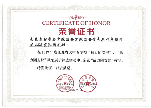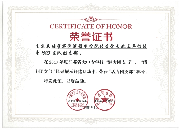 近日,团中央和团省委“活力团支部”评比活动落下帷幕,我校侦查1503团支部被评为2017年全国高校“活力团支部”,治安1402团支部和侦查1503团支部被评为2017年江苏省“活力团支部”。