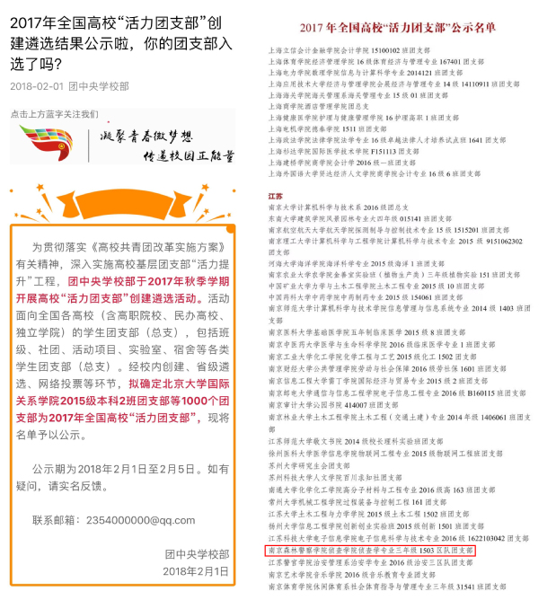 根据团中央和团省委要求,校团委在2017年11月从全校149个团支部中遴选了6个团支部参加省级评比活动,通过PU平台校内展示、PU平台投票、团省委审核等环节,我校治安1402团支部和侦查1503团支部从全省千余个高校团支部中脱颖而出,被评为2017年江苏省“活力团支部”(全省仅200个)。侦查1503团支部被团省委推荐参加团中央的全国高校共青团“活力团支部”创建遴选活动,经过层层选拔,从全国众多高校团支部中脱颖而出,被评为2017年全国高校“活力团支部”,全省仅60个高校团支部获此殊荣。