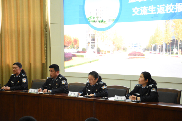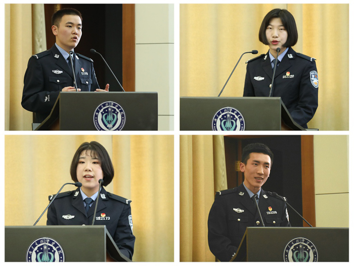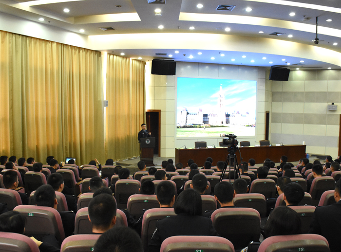 在简短而又温馨的回顾视频后,公管1502区队的毕岳、侦查1506区队的王梦源、治安1505区队的朱一丹以及侦查1606区队的孙一斌代表从加拿大汉博公立学院归来的交流生作了发言。他们图文并茂地向在场的同学展示了加拿大四个月忙碌充实、多姿多彩的交流生活,分享了自己的学习体会。他们表示,交流项目让他们受益匪浅,不仅学到了一些先进的警务技能和经验,培养了国际化的视野,而且还提高了自己的独立生活能力和英语交流能力。他们还结合自己的亲身经历介绍了赴加交流学习的注意事项,为即将报名参加2018年交流活动的同学提供了很好的借鉴。