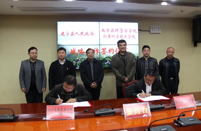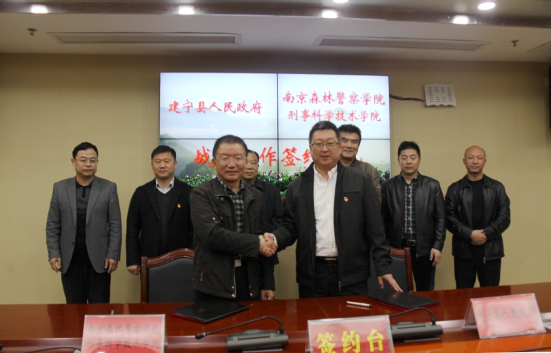 3月19日,南京森林警察学院刑事科学技术学院与福建省建宁县签署校地战略合作协议。副校长吉小林,刑事科学技术学院院长蒋敬,总支副书记赵红刚,县委常委、副县长王楠,县委常委政法委书记余传贵,科技副县长王平,县公安局长江长青,闽江源国家自然保护区管理局局长陈炳云,县政府办公室主任黄允健,县林业局局长吴建清,县森林公安局局长艾贵成,及建宁县各乡镇主要领导出席签约仪式。会议由县委常委、副县长王楠主持。