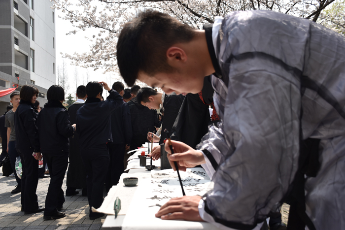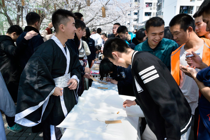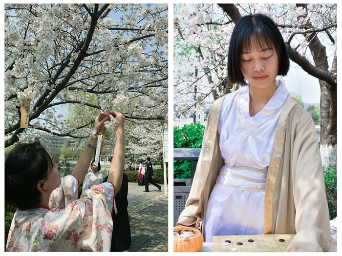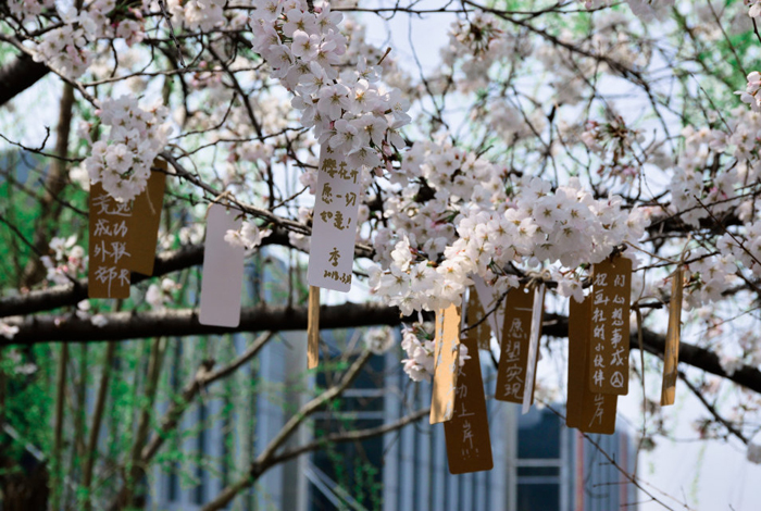 中午十二点,参加活动的同学们穿上美丽的汉服,在樱花雨中,握画笔细细涂抹、提毛笔挥毫泼墨、执棋子气定神闲、拨琴弦悦耳动听。在传统的“赏红”环节,来往同学参与的热情也非常高,他们纷纷在祈愿签上写下了对未来的美好期许,活动方贴心地为大家把祈愿签挂在了樱枝上,在樱花树上随着春风摇曳。