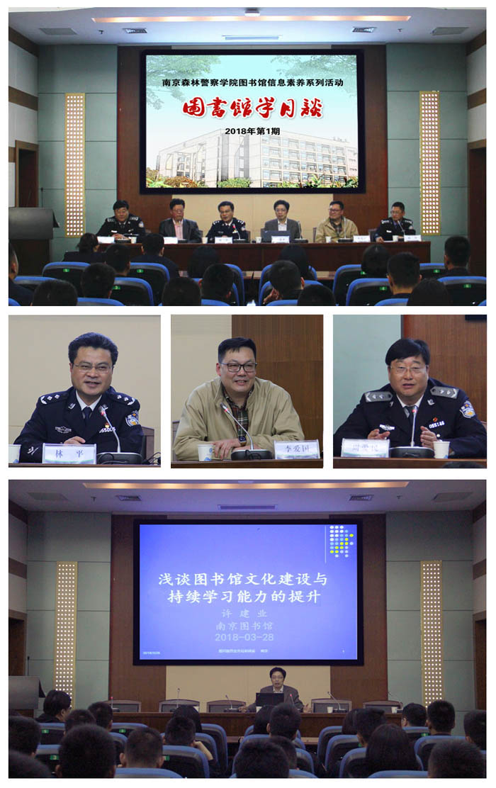 2018年3月28日下午,南京森林警察学院“图书馆半月谈”系列活动在学校小报告厅开幕。“图书馆半月谈”系列活动是开展阅读推广的一项新举措,开创了高校图书馆阅读推广活动的先河,是吸引读者充分利用图书馆资源的有益的尝试和创新。