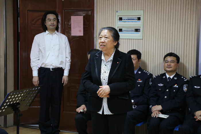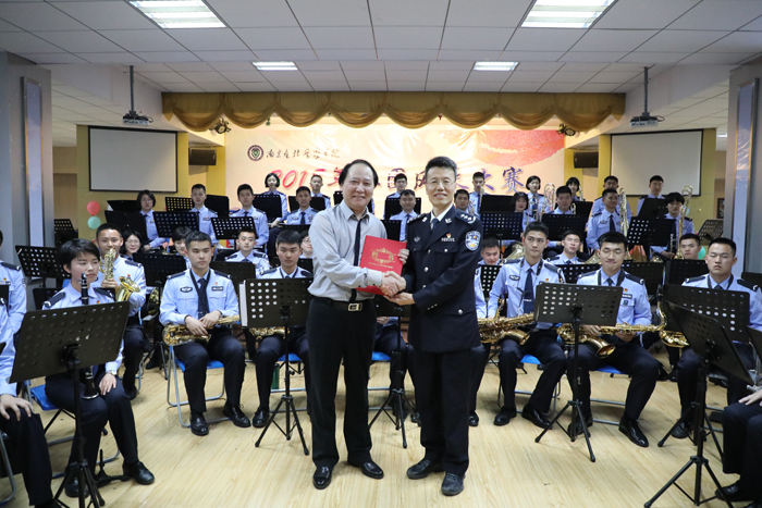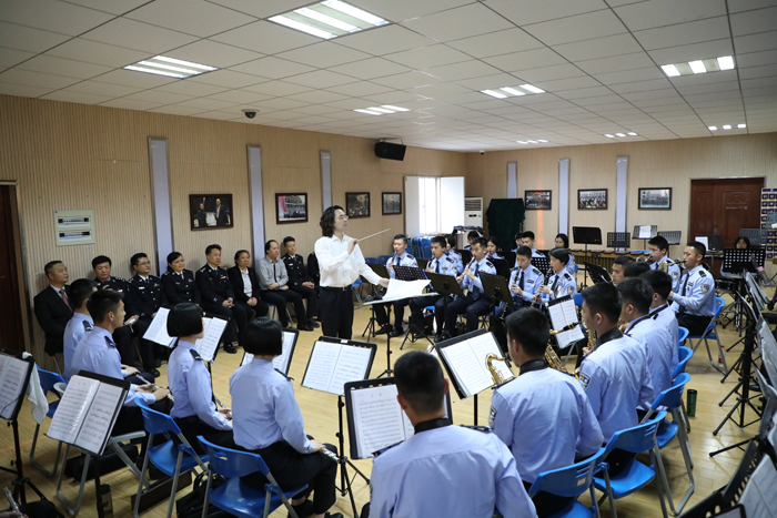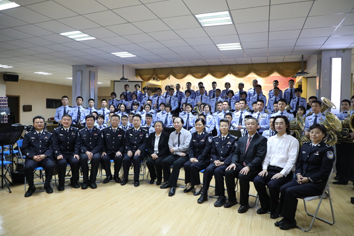 全国公安文联副主席王亚茹一行到警乐团观看了同学们的表演。同学们在陆铭老师的指挥下演奏了《号角》《征程》,铿锵有力的乐曲、饱满的精神状态获得了领导、艺术家们的一致肯定。王亚茹副主席代表全国公安文联对同学们为全国公安院校管乐基地作出的努力表示感谢和慰问。她指出,同学们从零起步,经过短短一到两年的刻苦排练,能熟练演奏如此大气磅礴的乐曲,这种精神非常令人感动。她希望同学们再接再厉,将乐团发扬光大,为繁荣公安文化做出更大的贡献。程东海导演对同学们的演奏和精神面貌给予高度评价,校党委王邱文书记现场为程东海导演颁发了我校“艺术教育顾问”的聘书。