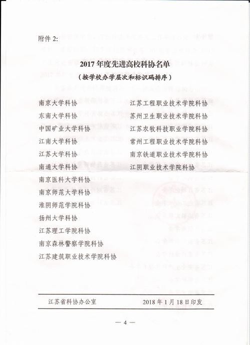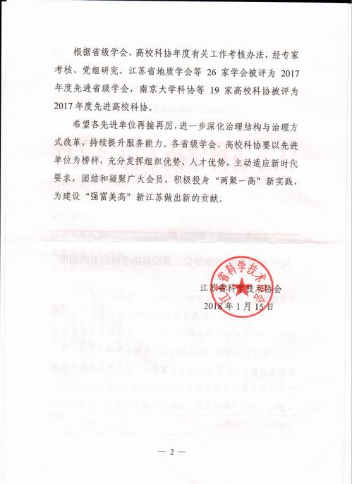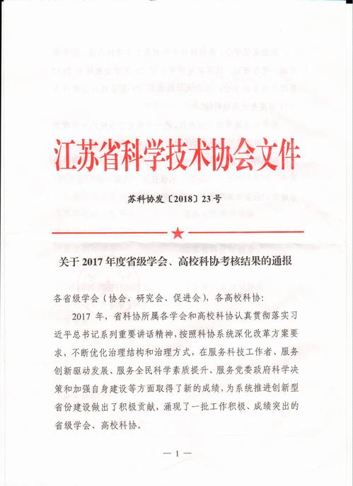 近日,江苏省科学技术协会发布《关于2017年度省级学会、高校科协考核结果的通报 》(苏科协发[2018]23号),我校科协荣获“2017年度江苏省先进高校科协”称号,这是我校科协自2013年成立以来连续5年获得该项荣誉,是省科协对我校科协工作的充分肯定和认可。我校科协将再接再厉,充分发挥桥梁和纽带作用,积极开展学术交流,促进学科发展,不断拓展提升服务质量和效率,激发师生的创新创造活力,进一步增强科协组织的凝聚力和影响力,推动科协工作再上新台阶。